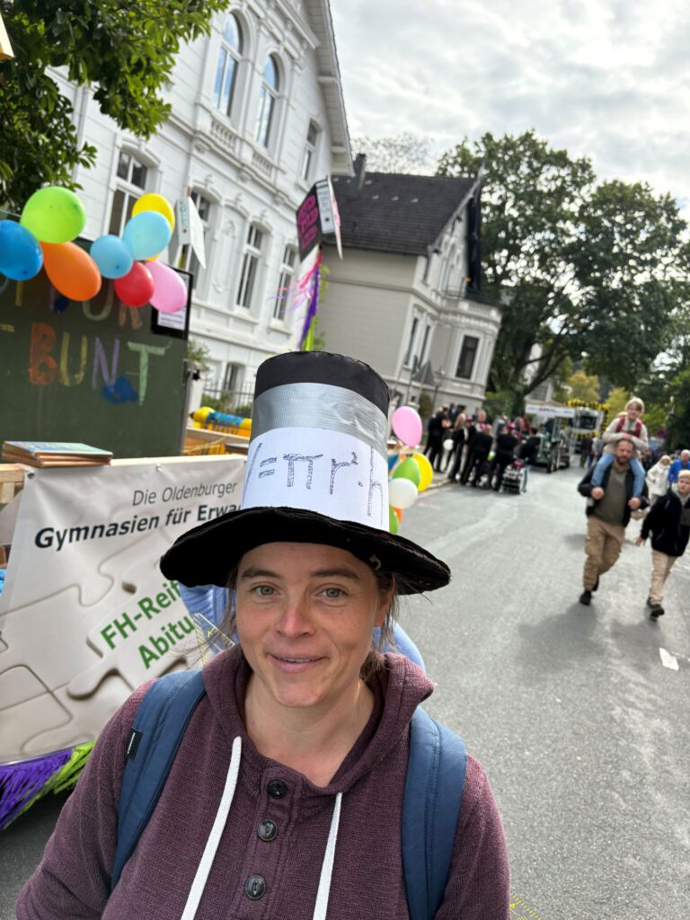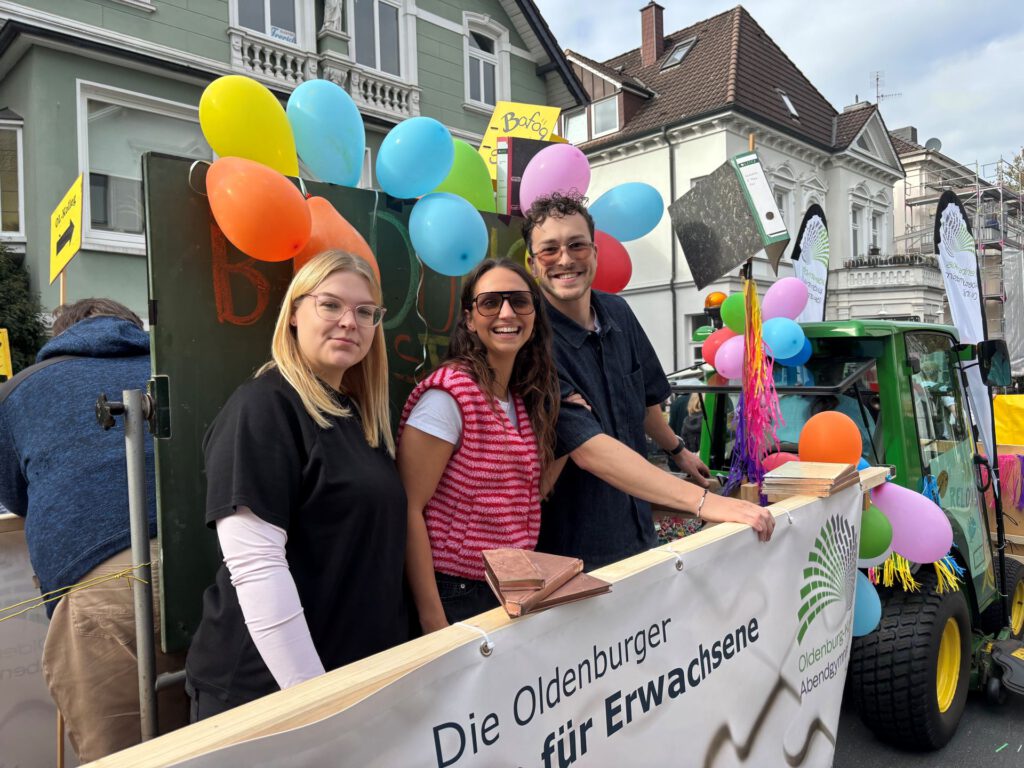 Aus einer Idee bei der gemeinsamen Weihnachtsfeier von Oldenburg-Kolleg und Abendgymnasium im letzten Jahr wurde diesen Samstag Realität: Das Oldenburg-Kolleg nahm mit einem Wagen am Kramermarktsumzug teil. Dabei waren Lehrer und Kollegiaten, die – teilweise fantasievoll verkleidet, getreu dem Motto „Bildung ist bunt“ – mit viel Elan Süßigkeiten verteilten und gleichzeitig Werbung für die immer noch vielen unbekannte Schulform des Kollegs machten.